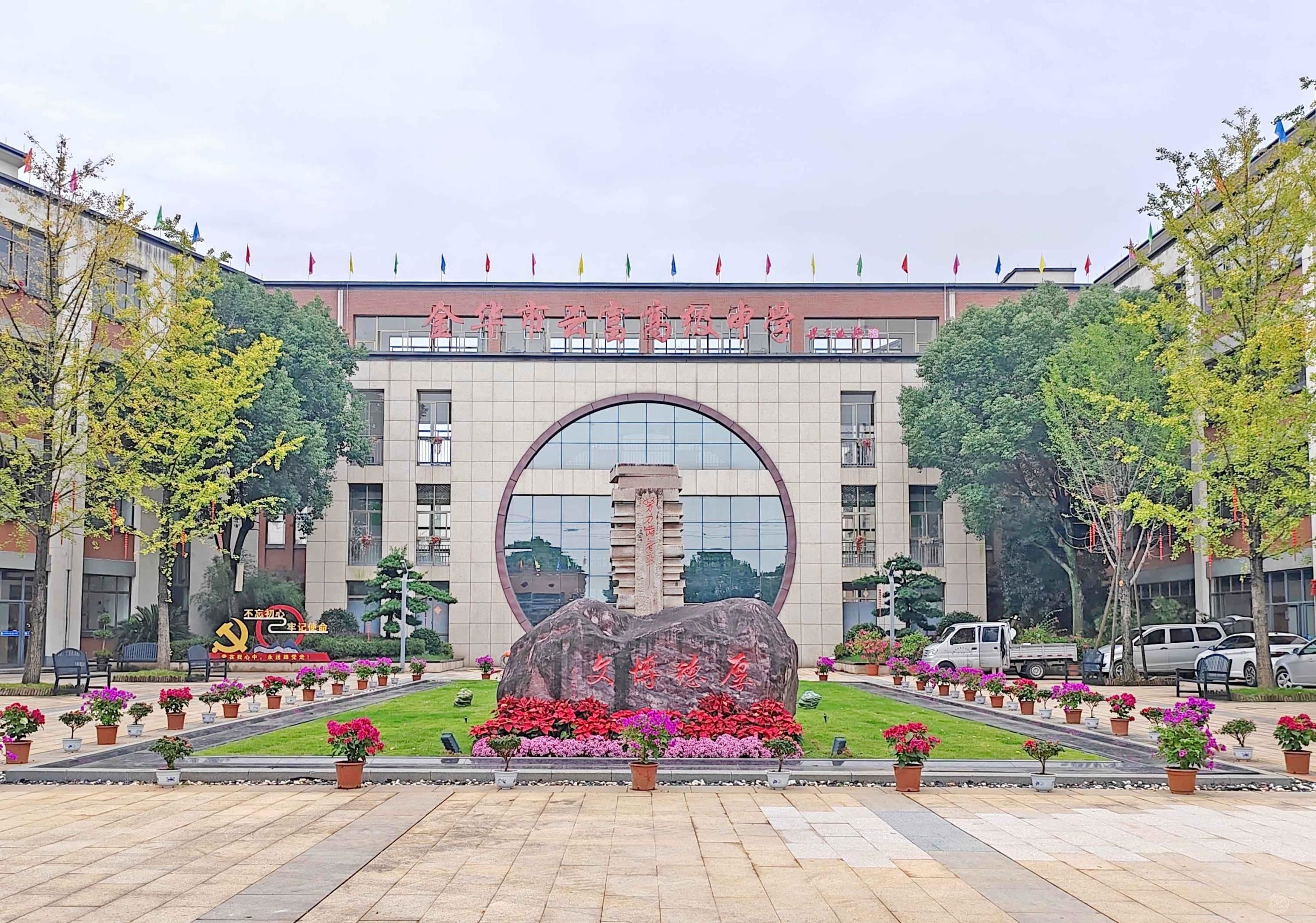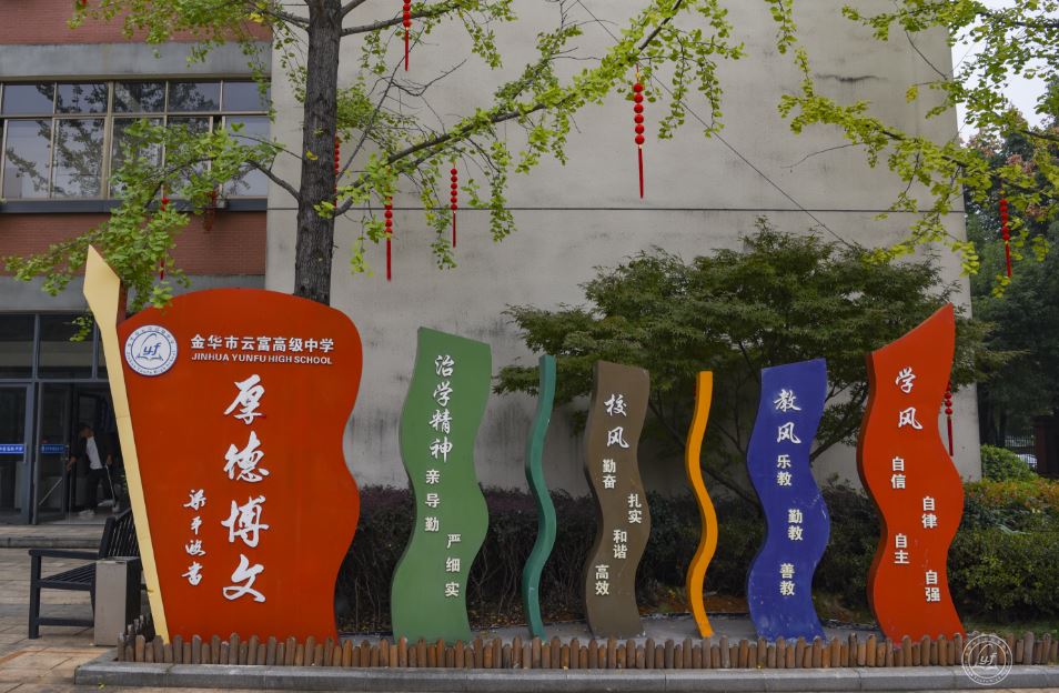 新校区位于风景秀丽的金华开发区汤溪镇峙龙湖畔。一进校门,便是一位“老朋友”——刻有“厚德博文”校训的大石头,它见证了云富中学的成长。虽是全新的环境,但也有熟悉的内容——一张张荣誉的照片,一幕幕精彩的瞬间画面,一句句被铭记于心的校风标语,属于云富的元素,渐渐已经渗透到各个角落。