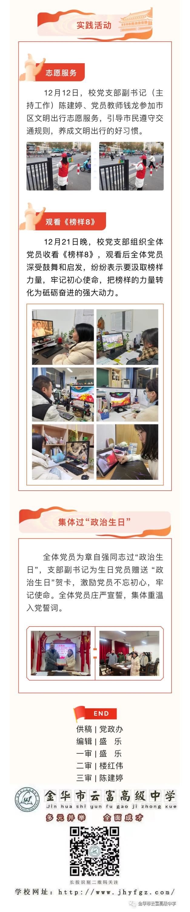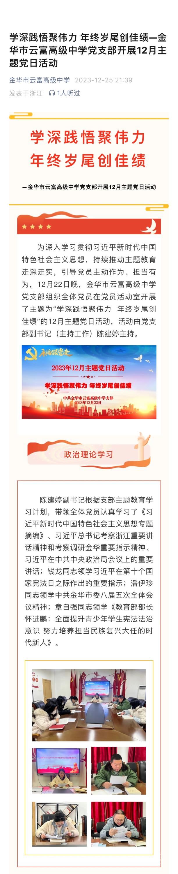 学深践悟聚伟力 年终岁尾创佳绩—金华市云富高级中学党支部开展12月主题党日活动