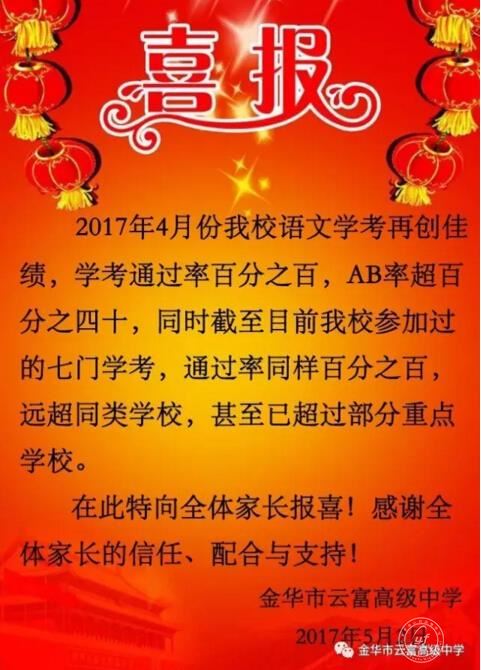 为此,在学校取得优异成绩的时刻,感谢家长支持,老师们的辛勤,我们坚信,在大家的共同努力下,云富学子定会在高考中创造奇迹!