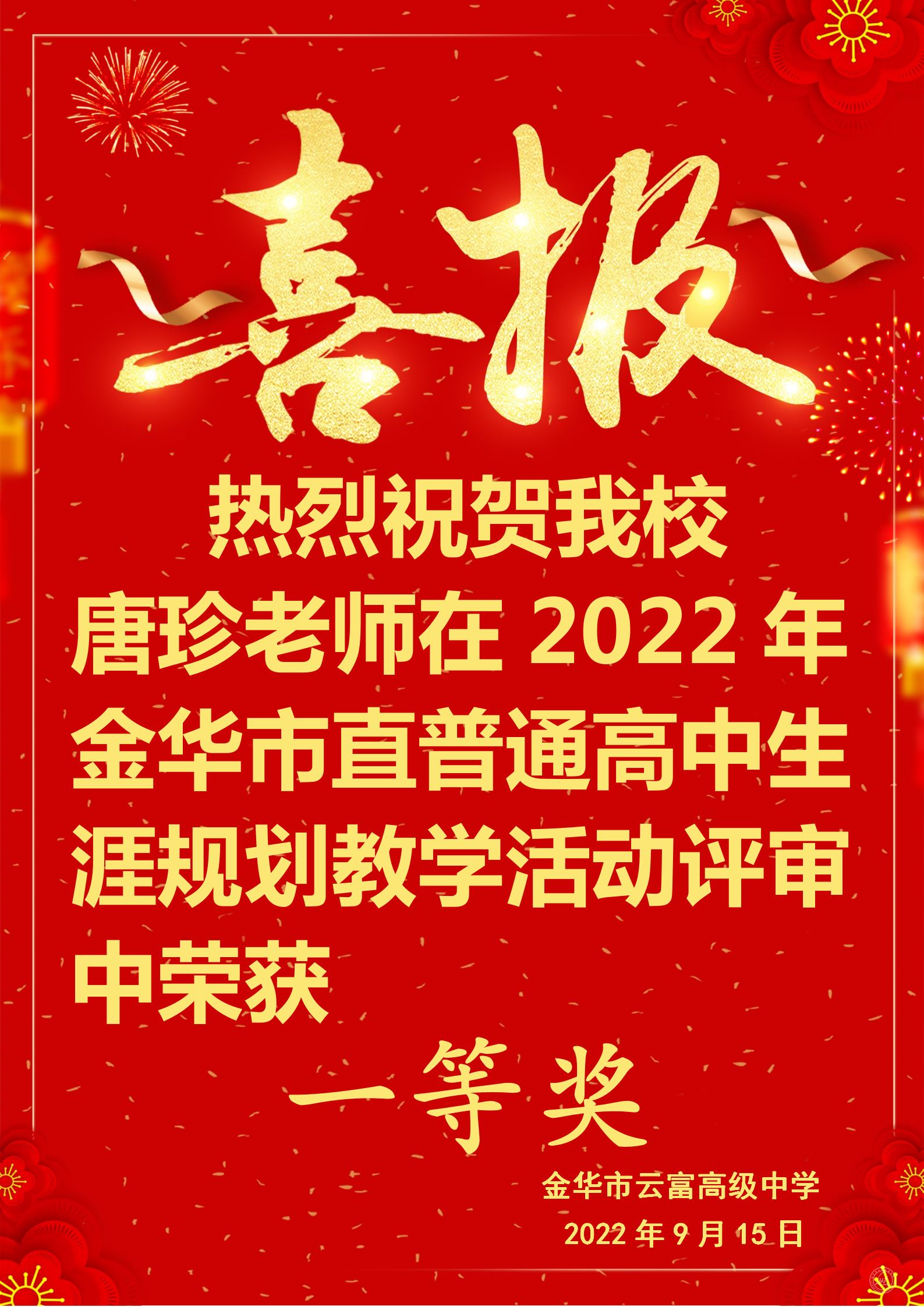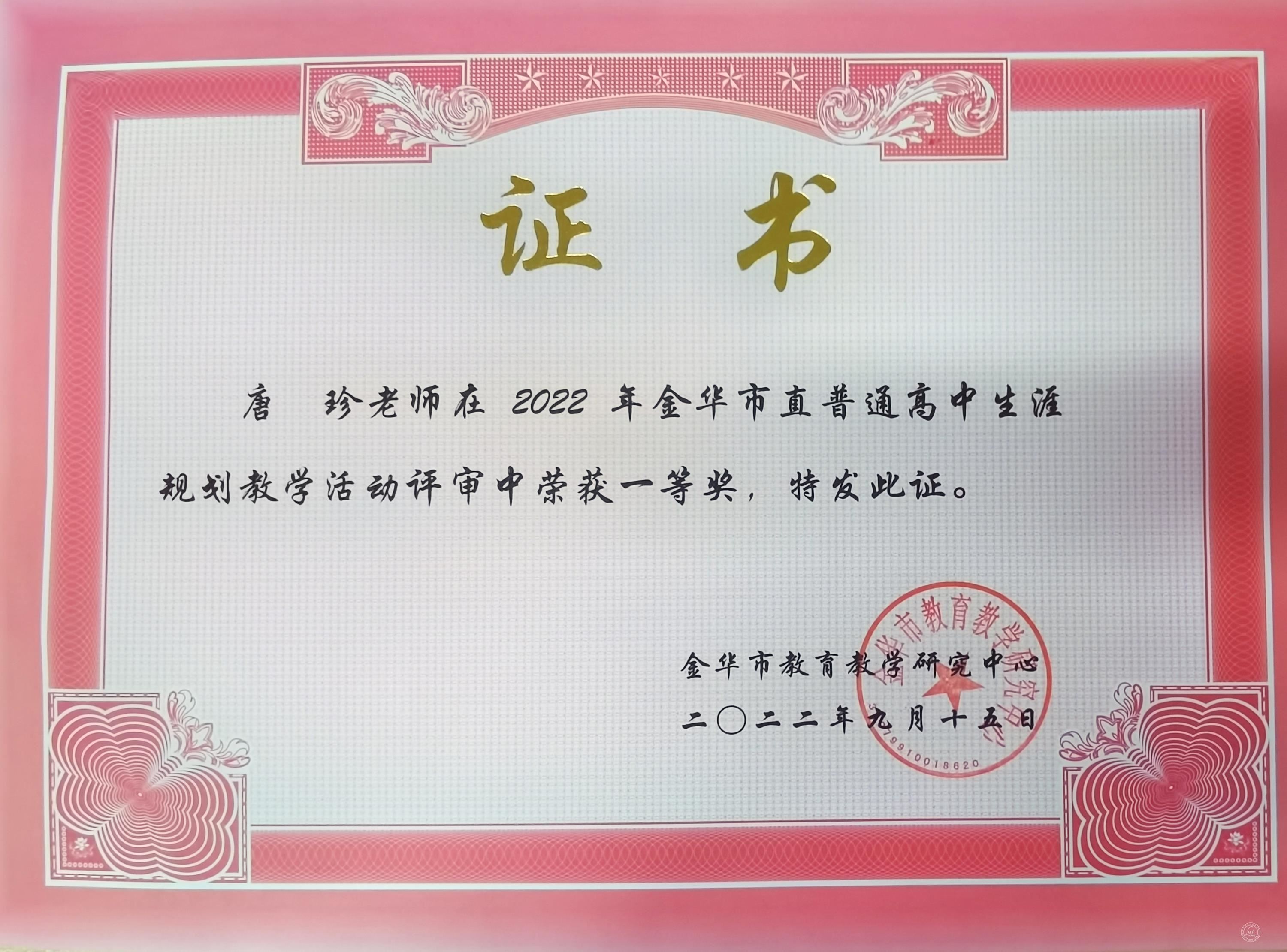 热烈祝贺我校唐珍老师在2022年金华市直普通高中生涯规划教学活动评审中荣获一等奖